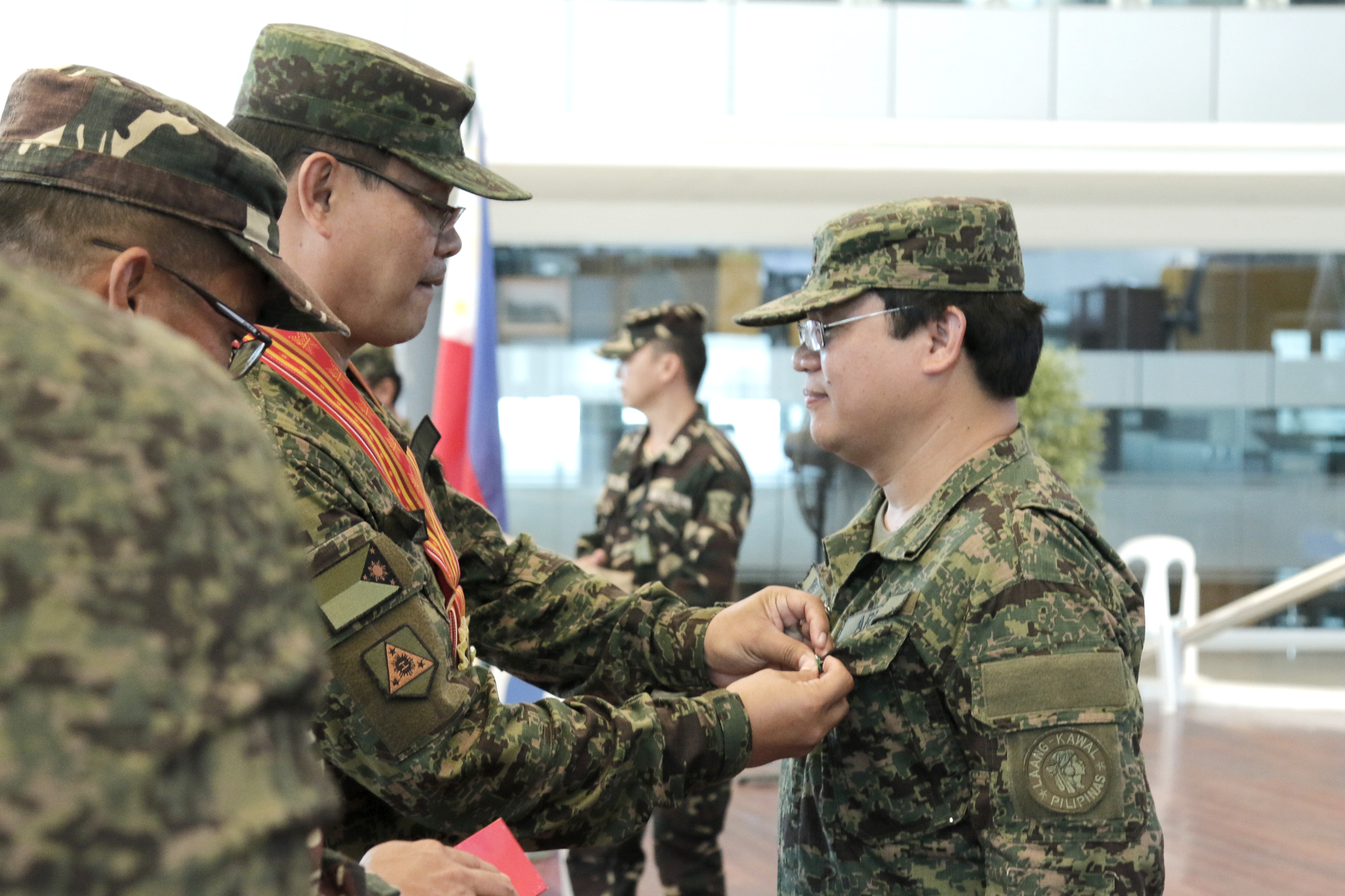 LTC ALLAN L. RELLON (RES) PA, Acting Commander, 2201st Ready Reserve Brigade and 1102nd Ready Reserve Battalion, respectively, is awarded with military commendation for his exemplary leadership in ensuring that the mission of the Reserve Force is upheld. Donning the medal is COL. MANING S. TAWANTAWAN INF (GSC) PA, Group Commander, 11RCDG, ARESCOM. Jay Apostol/CIO Tagum