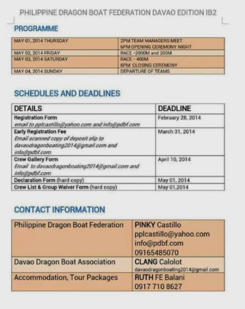 For more information, contact Philippine Dragonboat Federation (PDBF) Davao area head retired Major General Charly Holganza at mobile number (0917) 704-1956 or Ronnel Abrenica or Charles Maxey of SDD-CMO at (082) 221-2266
