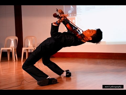 The young violinist bended his knees while playing some music. He’s like the “young male version” of Lindsey Stirling.
