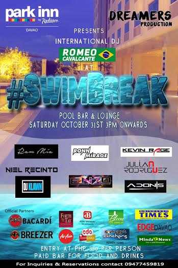 Ever wanted to enjoy swimming in a pool while dancing to some of today’s hottest DJ’s? You can!!! Dreamers Production and Bacardi Philippines in Partnership with Park Inn by Radisson Davao bring you “#SwimBreak,” on Saturday October 31, 2015 at the Pool Bar and Lounge of Park Inn by Radisson Davao.