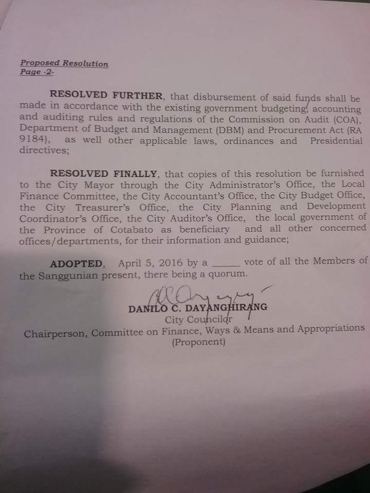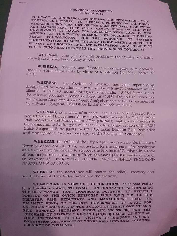 Just few days after Mayor Duterte said he will be asking the city council of Davao to extend help, the council after today’s session completed the passing of resolution allowing the honorable mayor to use the 5% of Davao’s calamity funds to provide aide to the farmers of the Province of Cotabato.
