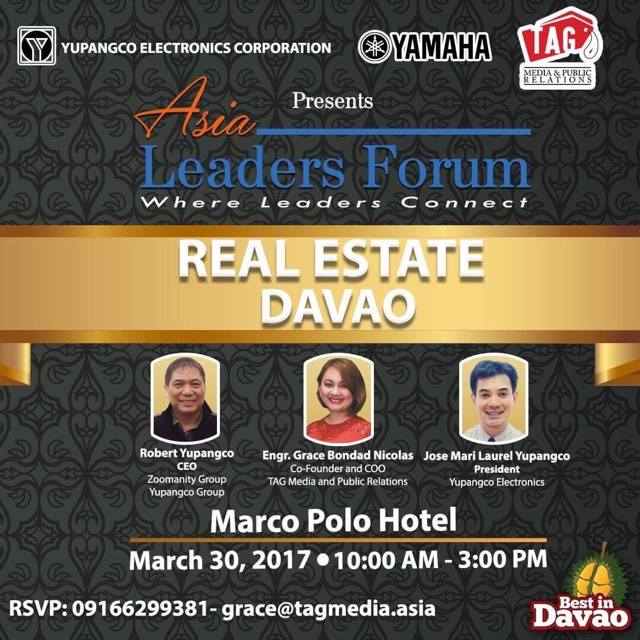 On March 30, 2017 from 10AM to 3PM, another Asia Leaders Forum in Real Estate will be launched in Davao this time with the collaboration between Yupangco Electronics Corporation (Distributor of Yamaha Sound and Audio Technology) headed by Jose Mari L. Yupangco and TAG Media and Public Relations headed by Engr. Grace Bondad Nicolas.