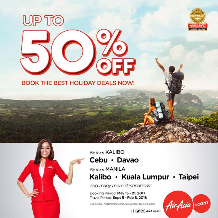 For flights to/from the Philippines, AirAsia is offering promo seats of up to 50% off for flights from Kalibo/Boracay to Davao and Cebu including flights from Manila to Kalibo/Boracay, Kuala Lumpur and Taipei.