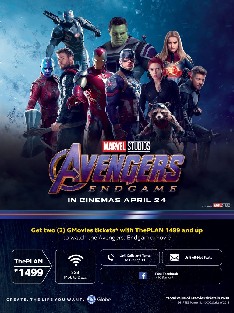 - Get 2 GMovies passes with the ThePLAN 1499 and above at select Globe Stores from April 5 to 30, 2019. Plus, all successful applications of ThePLAN PLUS 999 and up from April 16 to 30, 2019 will get a P350 discount voucher for the Avengers Funko POP collection at any Filbar’s store in GMA.